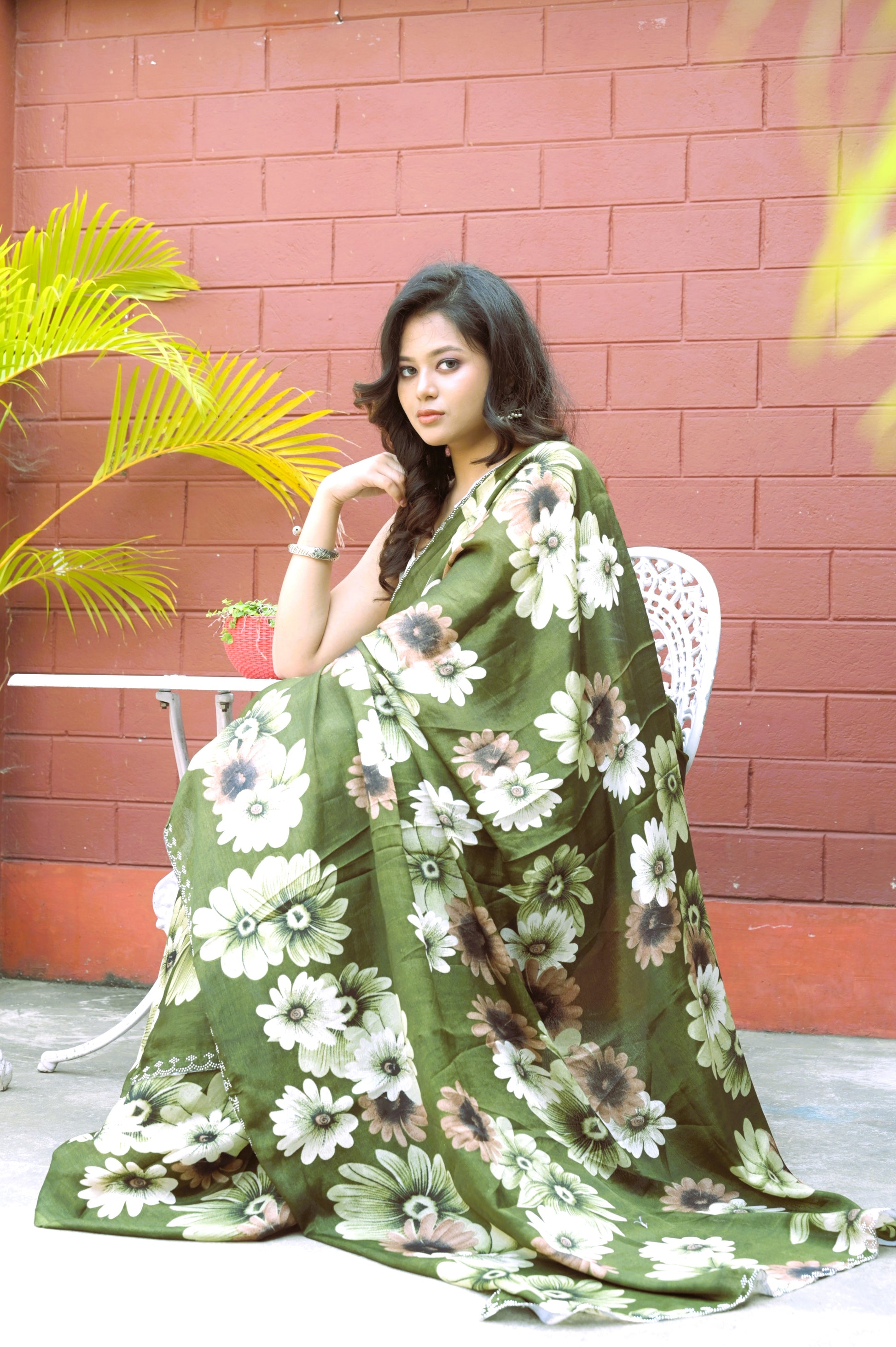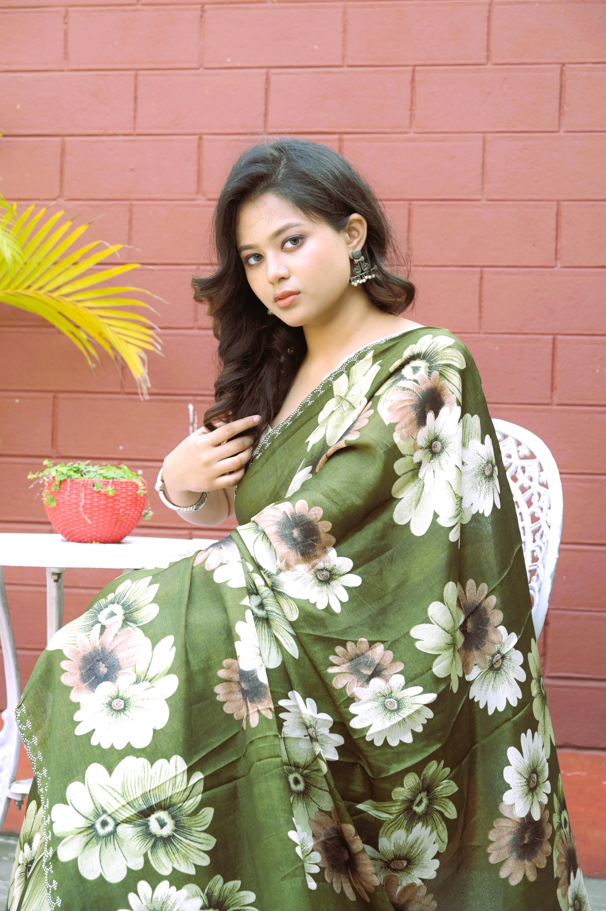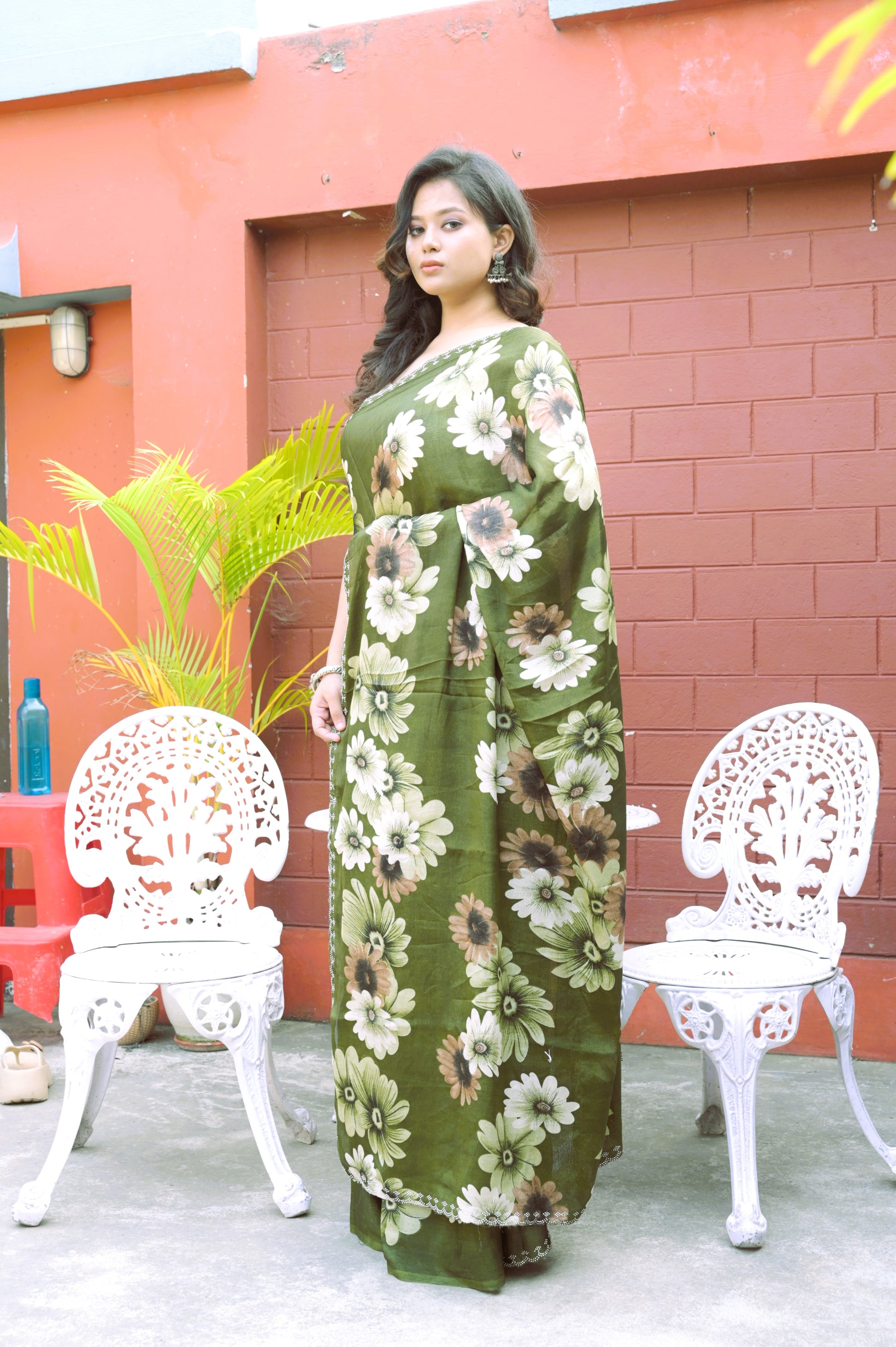 Crafted from Premium Chinon Silk, the saree drapes beautifully with a soft fluid fall that enhances your natural charm.