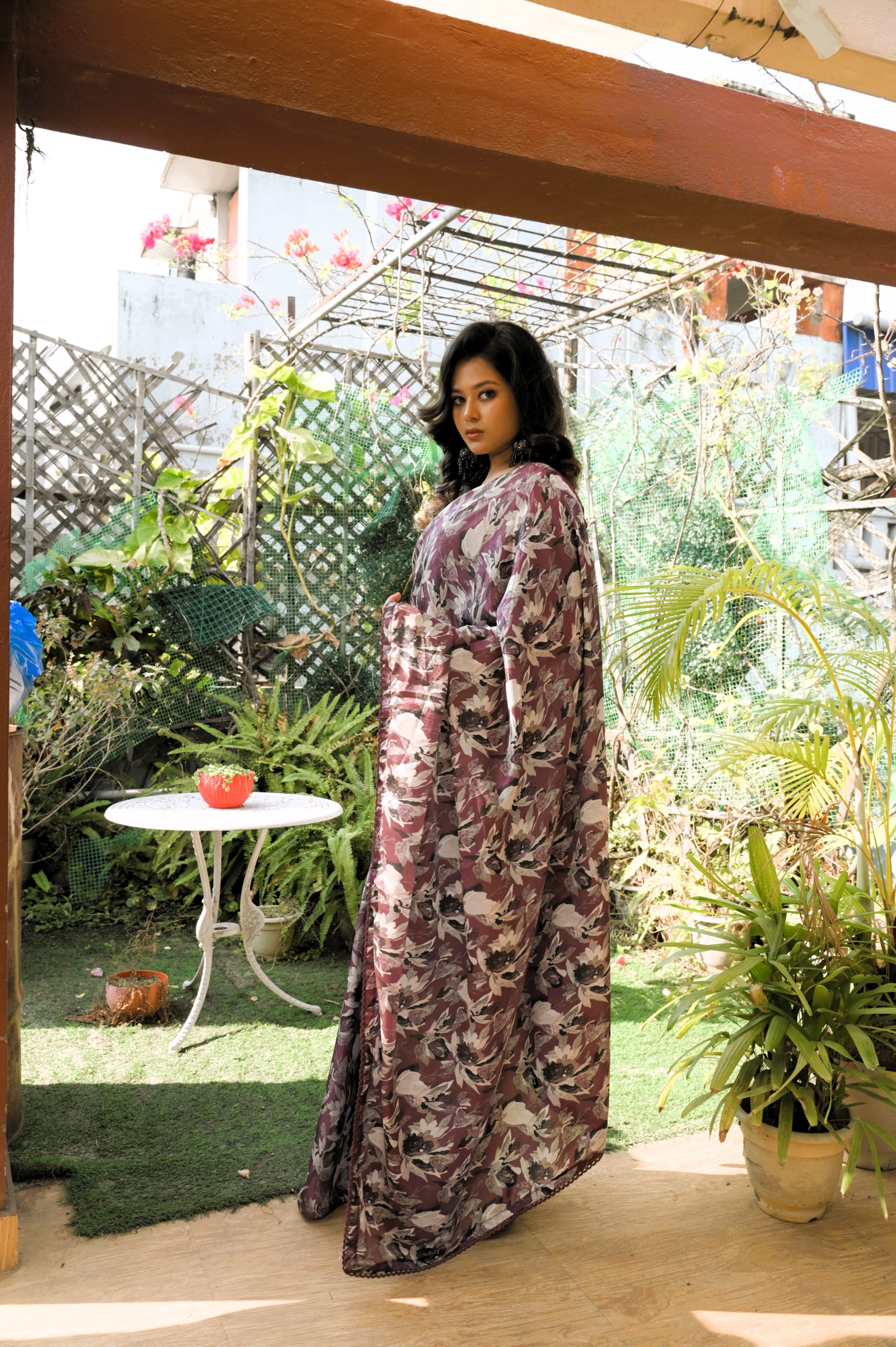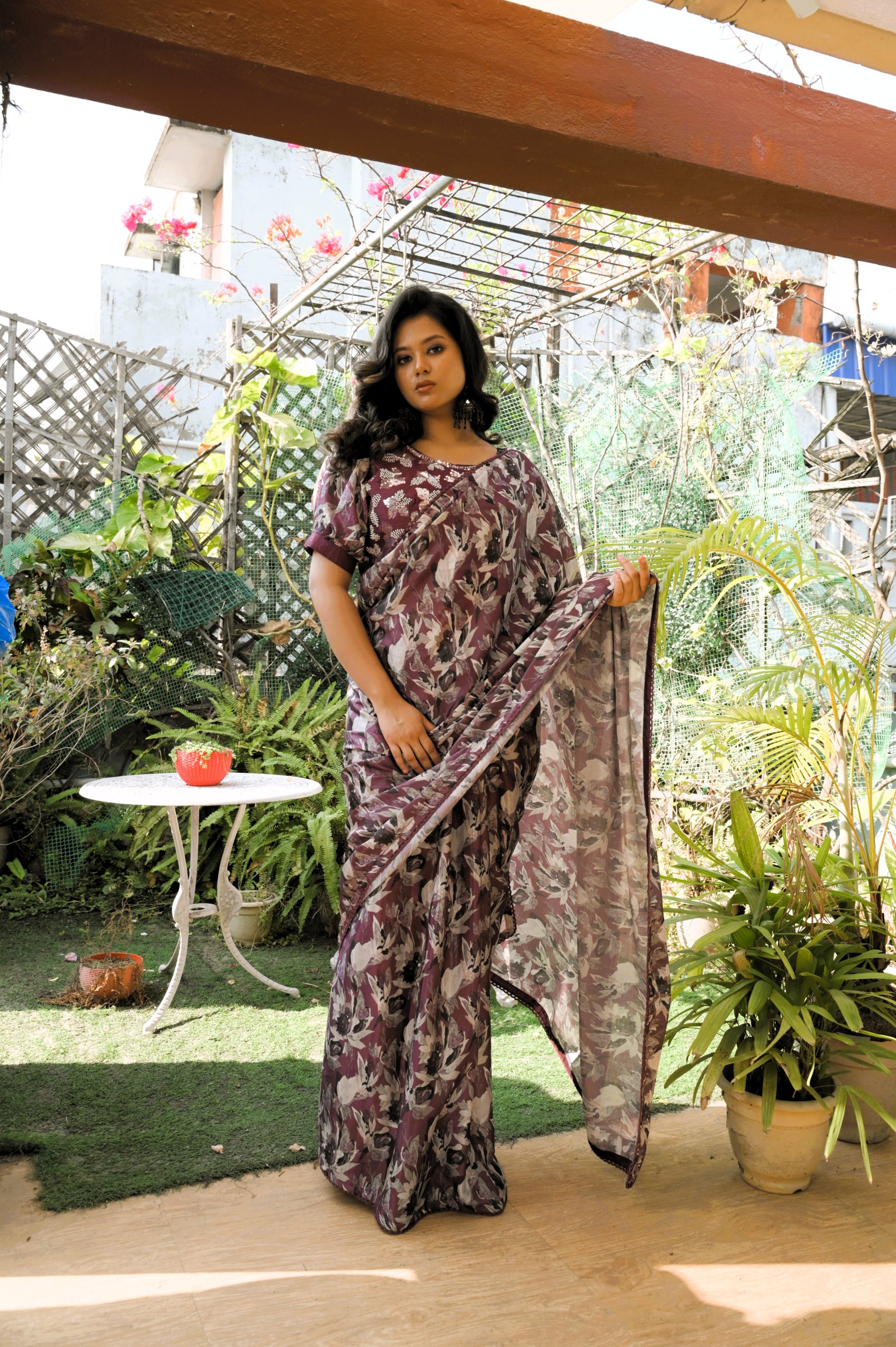 Premium Chinon Silk saree with elegant floral print (dry wash recommended)