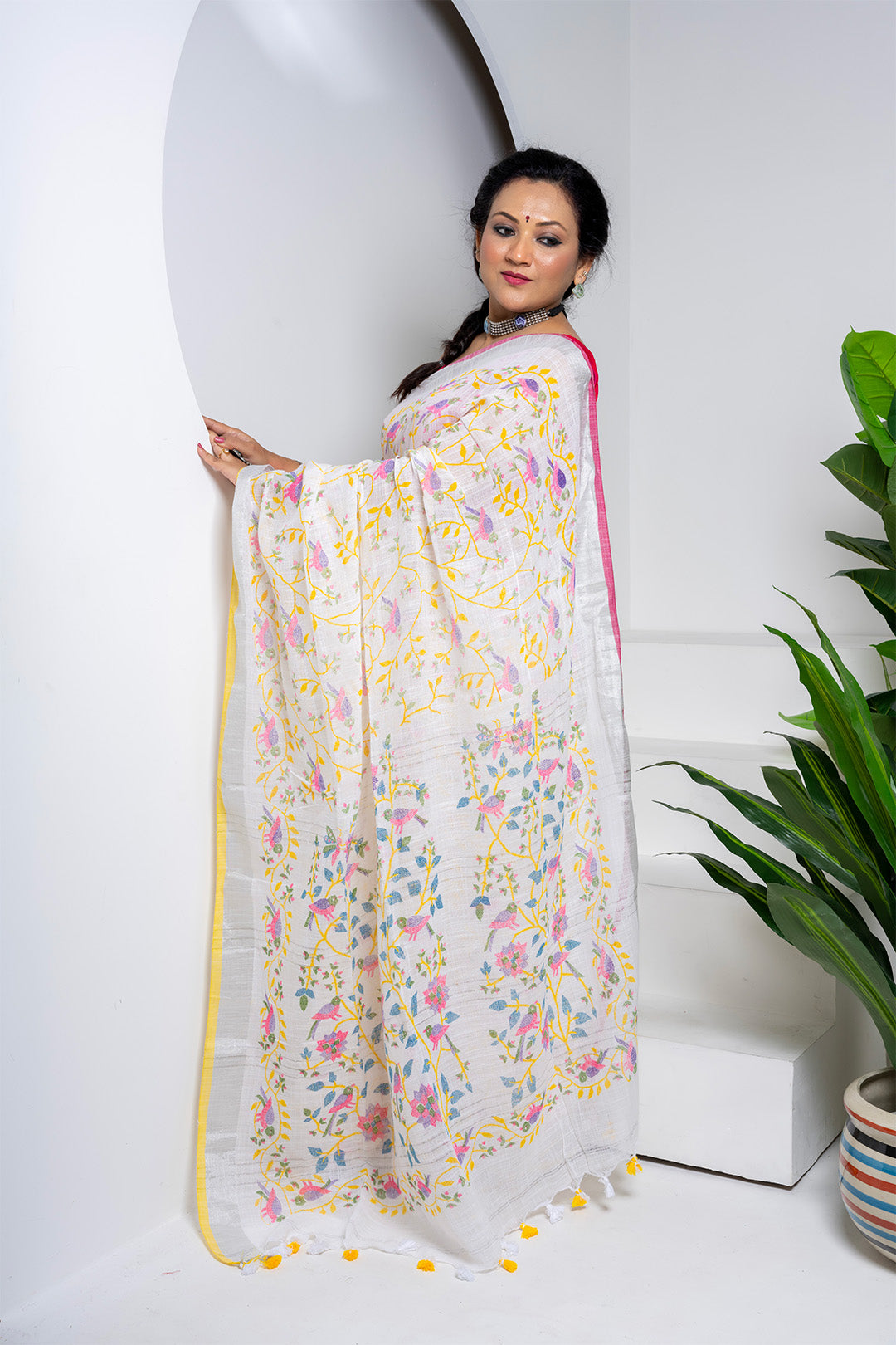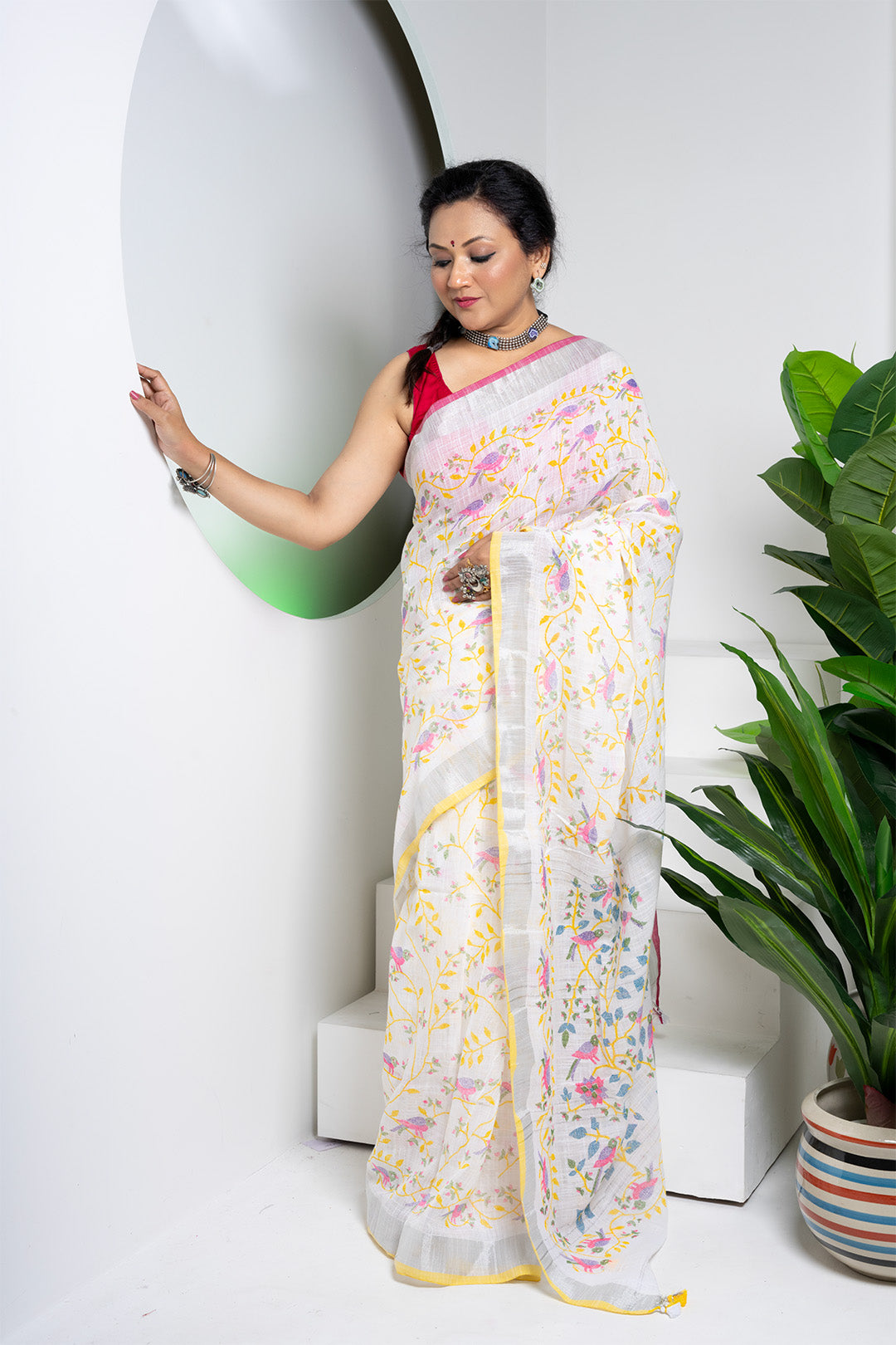 The saree represents the essence of first love—pure, untainted, and brimming with emotions that unfold like a delicate symphony. The pristine white base embodies innocence and serenity, while the yellow digital prints add a touch of warmth, joy, and blossoming affection. It mirrors the beauty of fleeting moments, where love is fresh, unspoken, yet deeply felt. Draping this saree is like wearing poetry—subtle, graceful, and endlessly enchanting.