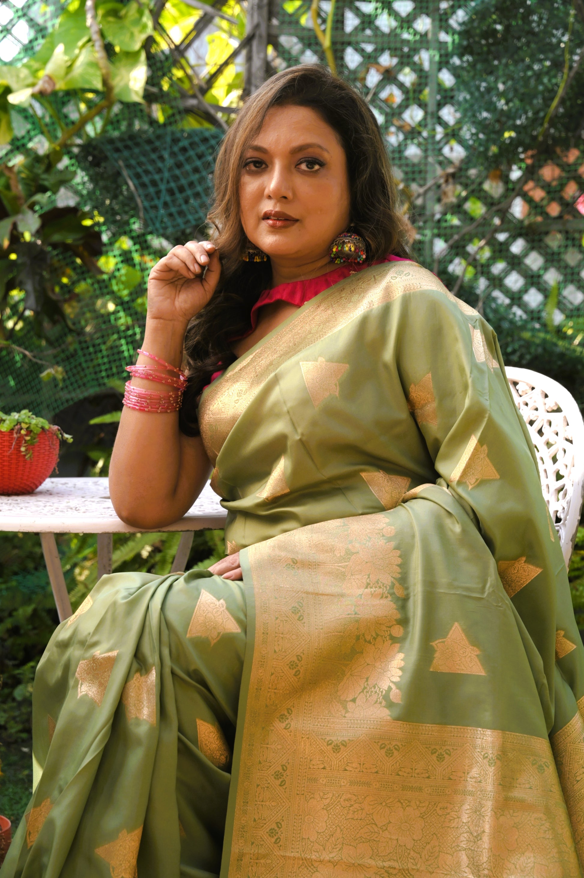 Gracefully woven in Olive - pista green soft silk, this elegant saree features subtle antique gold zari motifs across the body, complemented by a rich gold zari border and pallu with traditional floral detailing. Lightweight with a smooth, l.ustrous drape, it is perfect for celebratory purposes